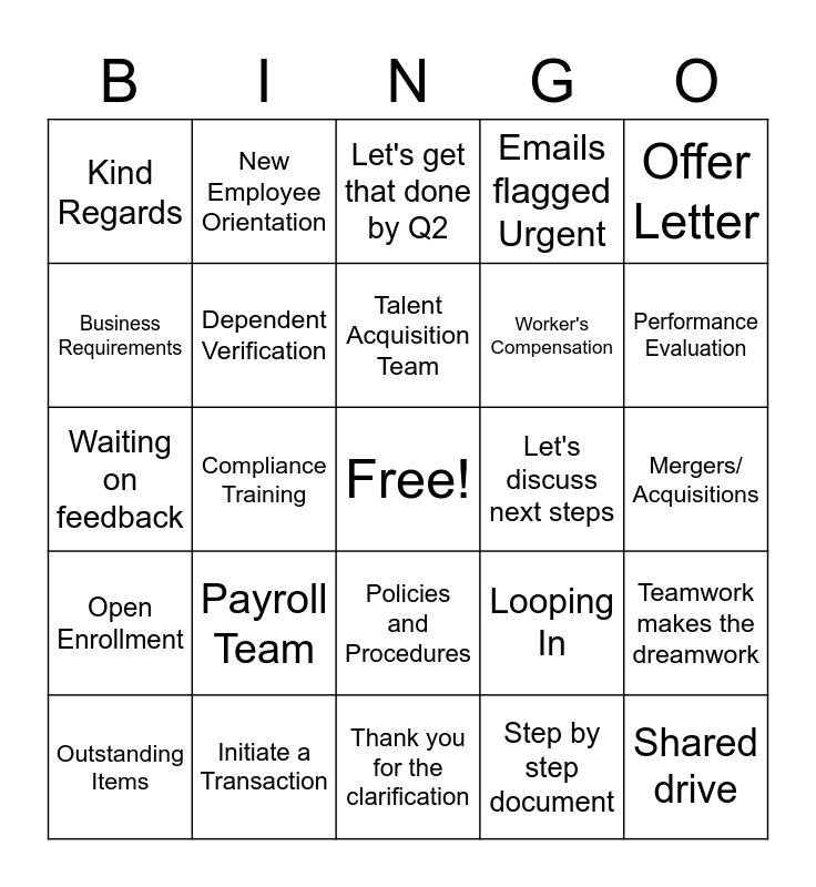 This bingo card has a free space and 24 words: Payroll Team, Initiate a Transaction, Talent Acquisition Team, Outstanding Items, Offer Letter, Kind Regards, Business Requirements, New Employee Orientation, Let's discuss next steps, Policies and Procedures, Worker's Compensation, Waiting on feedback, Looping In, Teamwork makes the dreamwork, Dependent Verification, Step by step document, Mergers/ Acquisitions, Let's get that done by Q2, Performance Evaluation, Compliance Training, Shared drive, Open Enrollment, Emails flagged Urgent and Thank you for the clarification.