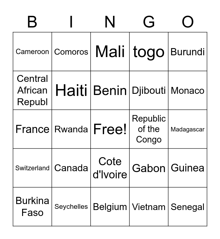 This bingo card has a free space and 25 words: Canada, Belgium, Benin, Burkina Faso, Burundi, Cameroon, Central African Republ, Comoros, Republic of the Congo, Cote d'lvoire, Djibouti, France, Gabon, Guinea, Haiti, Luxembourg, Madagascar, Mali, Monaco, Rwanda, Senegal, Seychelles, Switzerland, togo and Vietnam.