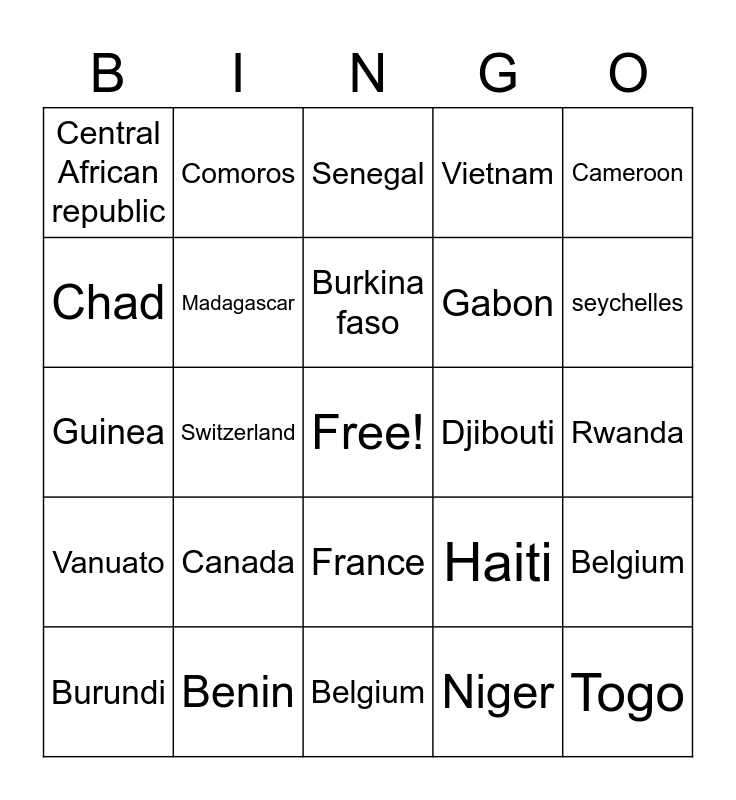 This bingo card has a free space and 24 words: Canada, Benin, Burkina faso, Burundi, Cameroon, Central African republic, Chad, Comoros, Djibouti, France, Gabon, Guinea, Haiti, Belgium, Madagascar, Niger, Rwanda, Senegal, seychelles, Switzerland, Togo, Vanuato, Vietnam and Belgium.