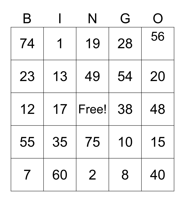 This bingo card has a free space and 24 words: 35, 60, 49, 7, 56, 74, 23, 1, 38, 75, 54, 12, 10, 15, 13, 8, 48, 19, 20, 17, 40, 55, 28 and 2.