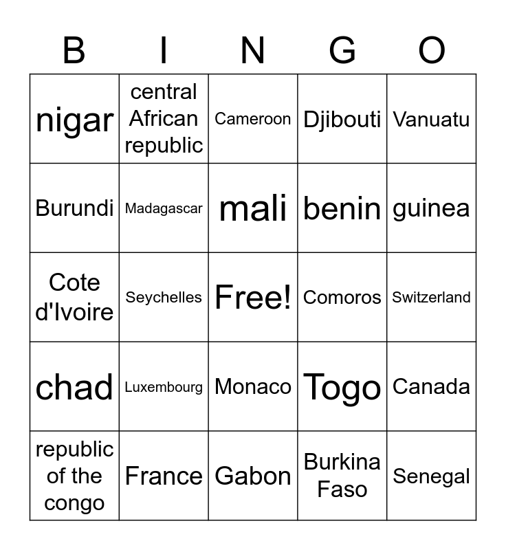 This bingo card has a free space and 28 words: Canada, Belgium, benin, Burkina Faso, Burundi, Cameroon, central African republic, chad, Comoros, republic of the congo, Cote d'Ivoire, Djibouti, France, Gabon, guinea, Haiti, Luxembourg, Madagascar, mali, Monaco, nigar, Rwanda, Senegal, Seychelles, Switzerland, Togo, Vanuatu and Vietnam.