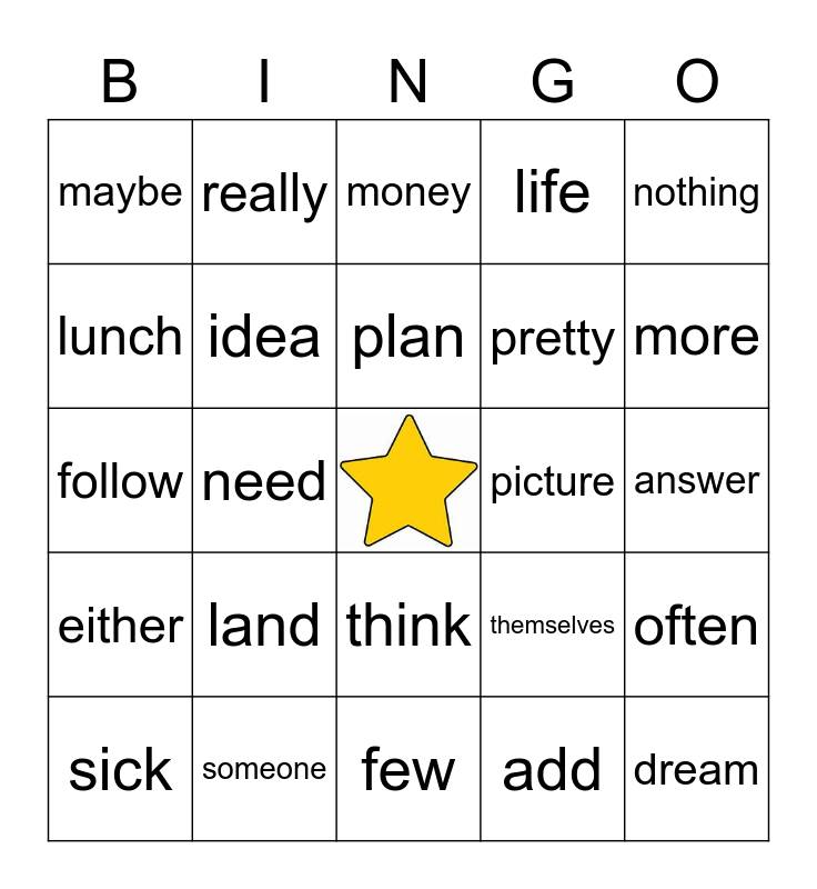 This bingo card has a free space and 29 words: sick, river, need, care, maybe, money, idea, land, picture, someone, answer, dream, few, add, more, less, think, either, nothing, follow, themselves, wanted, pretty, lunch, life, really, often, plan and near.