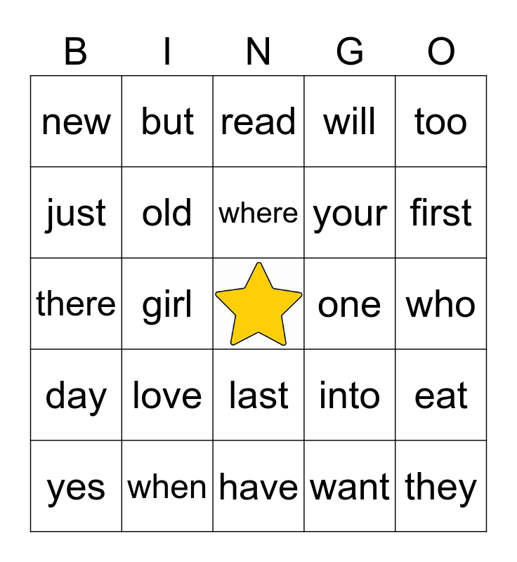 This bingo card has a free space and 29 words: yes, why, girl, ran, new, read, old, love, one, when, who, they, have, want, first, next, last, day, too, there, into, school, your, just, will, but, eat, where and man.