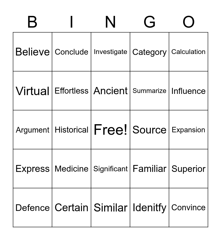 This bingo card has a free space and 24 words: Medicine, Certain, Ancient, Defence, Calculation, Believe, Virtual, Conclude, Source, Significant, Summarize, Argument, Familiar, Superior, Effortless, Idenitfy, Expansion, Investigate, Influence, Historical, Convince, Express, Category and Similar.