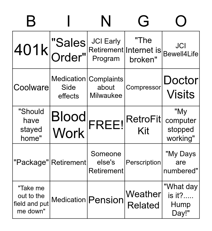 This bingo card has a free space and 24 words: Retirement, Medication, Complaints about Milwaukee, "Take me out to the field and put me down", JCI Bewell4Life, 401k, Coolware, "Sales Order", RetroFit Kit, Someone else's Retirement, Compressor, "Should have stayed home", Perscription, "My Days are numbered", Medication Side effects, Weather Related, "My computer stopped working", JCI Early Retirement Program, Doctor Visits, Blood Work, "What day is it?..... Hump Day!", "Package", "The Internet is broken" and Pension.
