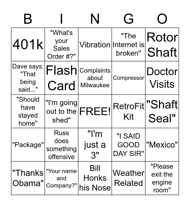 This bingo card has a free space and 24 words: Russ does something offensive, "Your name and Company?", Complaints about Milwaukee, "Thanks Obama", Rotor Shaft, 401k, Dave says: "That being said...", "What's your Sales Order #?", RetroFit Kit, "I'm just a 3", Compressor, "Should have stayed home", "I SAID GOOD DAY SIR", "Mexico", Flash Card, Weather Related, "Shaft Seal", Vibration, Doctor Visits, "I'm going out to the shed", "Please exit the engine room", "Package", "The Internet is broken" and Bill Honks his Nose.