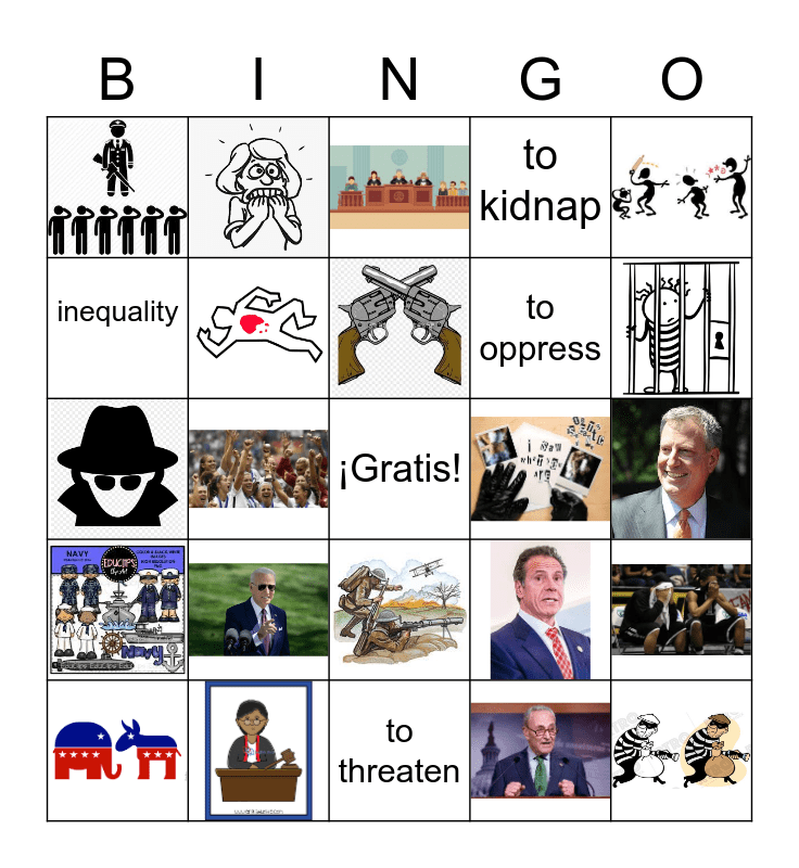 This bingo card has 28 images, a free space and 6 words: to threaten, to kidnap, to judge, to oppress, inequality and human rights.
