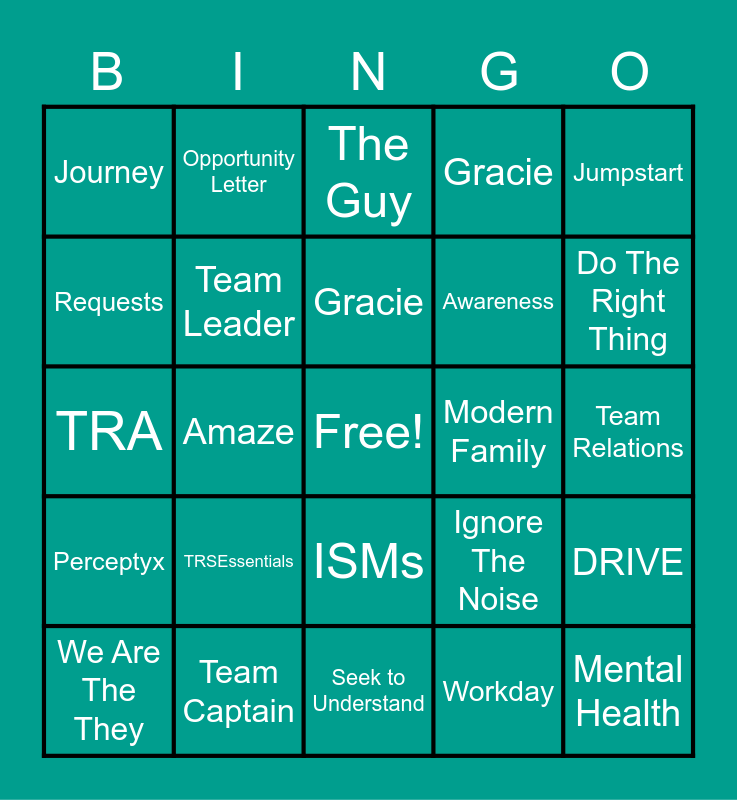 This bingo card has a free space and 40 words: TRS, TRA, PBP, Team Leader, Team Captain, ISMs, Gracie, HR OnBase, Jumpstart, Perceptyx, Amaze, Gracie, Mental Health, Team Relations, Modern Family, TRSEssentials, Sift, Journey, All In, The Guy, DRIVE, Workday, Awareness, Requests, Sep Letter, Amrock, Rock Central, Bedrock, Quicken Loans, Accommodations, We'll figure It Out, We Are The They, Yes before No, Ignore The Noise, Do The Right Thing, Seek to Understand, Coaching, Verbal Warning, Opportunity Letter and Separations.