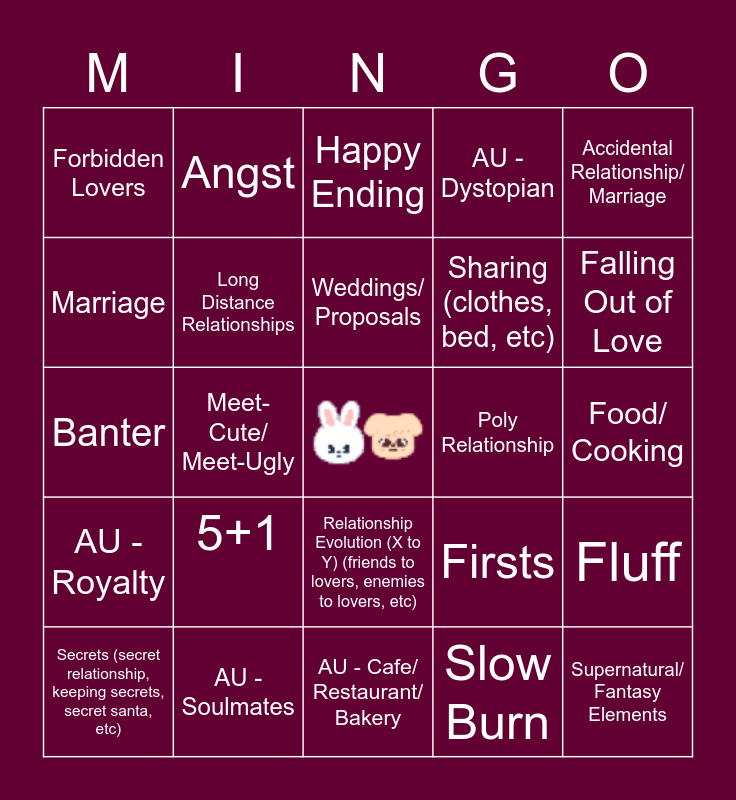 This bingo card has a free space and 24 words: 5+1, AU - Soulmates, Weddings/ Proposals, Secrets (secret relationship, keeping secrets, secret santa, etc), Accidental Relationship/ Marriage, Forbidden Lovers, Marriage, Angst, Poly Relationship, Relationship Evolution (X to Y) (friends to lovers, enemies to lovers, etc), Sharing (clothes, bed, etc), Banter, Firsts, Fluff, Long Distance Relationships, Slow Burn, Food/ Cooking, Happy Ending, Falling Out of Love, Meet-Cute/ Meet-Ugly, Supernatural/ Fantasy Elements, AU - Royalty, AU - Dystopian and AU - Cafe/ Restaurant/ Bakery.