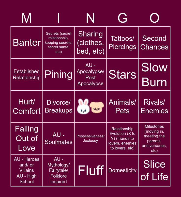 This bingo card has a free space and 24 words: AU - Soulmates, AU - Mythology/ Fairytale/ Folklore Inspired, AU - Apocalypse/ Post Apocalypse, AU - Heroes and/ or Villains AU - High School, Second Chances, Banter, Established Relationship, Secrets (secret relationship, keeping secrets, secret santa, etc), Animals/ Pets, Possessiveness/ Jealousy, Stars, Hurt/ Comfort, Relationship Evolution (X to Y) (friends to lovers, enemies to lovers, etc), Milestones (moving in, meeting the parents, anniversaries, etc), Pining, Domesticity, Rivals/ Enemies, Sharing (clothes, bed, etc), Slow Burn, Divorce/ Breakups, Slice of Life, Falling Out of Love, Tattoos/ Piercings and Fluff.