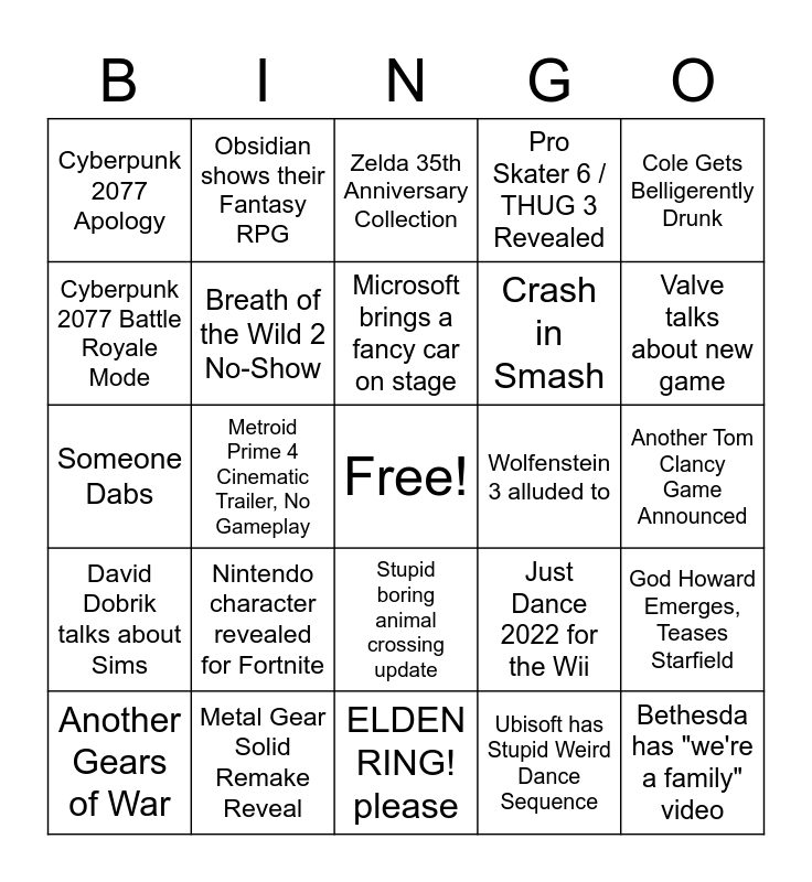This bingo card has a free space and 24 words: Nintendo character revealed for Fortnite, Metal Gear Solid Remake Reveal, Microsoft brings a fancy car on stage, Another Gears of War, Cole Gets Belligerently Drunk, Cyberpunk 2077 Apology, Cyberpunk 2077 Battle Royale Mode, Obsidian shows their Fantasy RPG, Wolfenstein 3 alluded to, Stupid boring animal crossing update, Crash in Smash, Someone Dabs, Just Dance 2022 for the Wii, God Howard Emerges, Teases Starfield, Breath of the Wild 2 No-Show, Ubisoft has Stupid Weird Dance Sequence, Another Tom Clancy Game Announced, Zelda 35th Anniversary Collection, Valve talks about new game, Metroid Prime 4 Cinematic Trailer, No Gameplay, Bethesda has "we're a family" video, David Dobrik talks about Sims, Pro Skater 6 / THUG 3 Revealed and ELDEN RING! please.