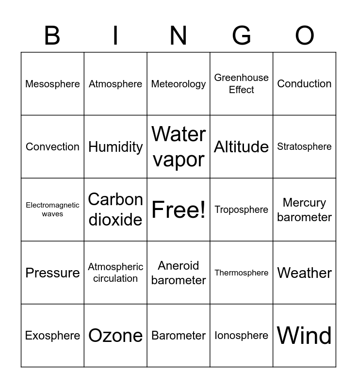 This bingo card has a free space and 28 words: Weather, Density, Altitude, Ionosphere, Convection, Meteorology, Atmosphere, Pressure, Troposphere, Exosphere, Electromagnetic waves, Greenhouse Effect, Ozone, Barometer, Stratosphere, Albedo, Atmospheric circulation, Humidity, Water vapor, Aneroid barometer, Mesosphere, Radiation, Wind, Carbon dioxide, Mercury barometer, Thermosphere, Conduction and Climate.