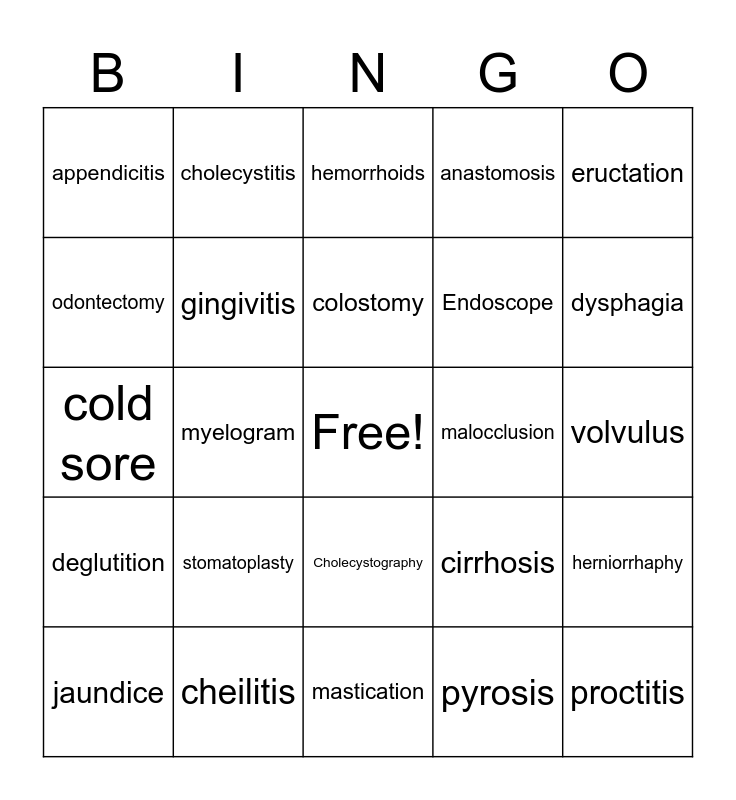This bingo card has a free space and 24 words: stomatoplasty, cheilitis, colostomy, jaundice, eructation, appendicitis, odontectomy, cholecystitis, malocclusion, Cholecystography, Endoscope, cold sore, cirrhosis, herniorrhaphy, gingivitis, pyrosis, volvulus, hemorrhoids, dysphagia, myelogram, proctitis, deglutition, anastomosis and mastication.