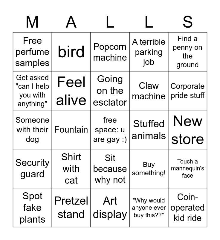 This bingo card has a free space and 24 words: Shirt with cat, Pretzel stand, Going on the esclator, Spot fake plants, Find a penny on the ground, Free perfume samples, Get asked "can I help you with anything", bird, Stuffed animals, Sit because why not, Claw machine, Someone with their dog, Buy something!, Touch a mannequin's face, Feel alive, "Why would anyone ever buy this??", New store, Popcorn machine, Corporate pride stuff, Fountain, Coin-operated kid ride, Security guard, A terrible parking job and Art display.