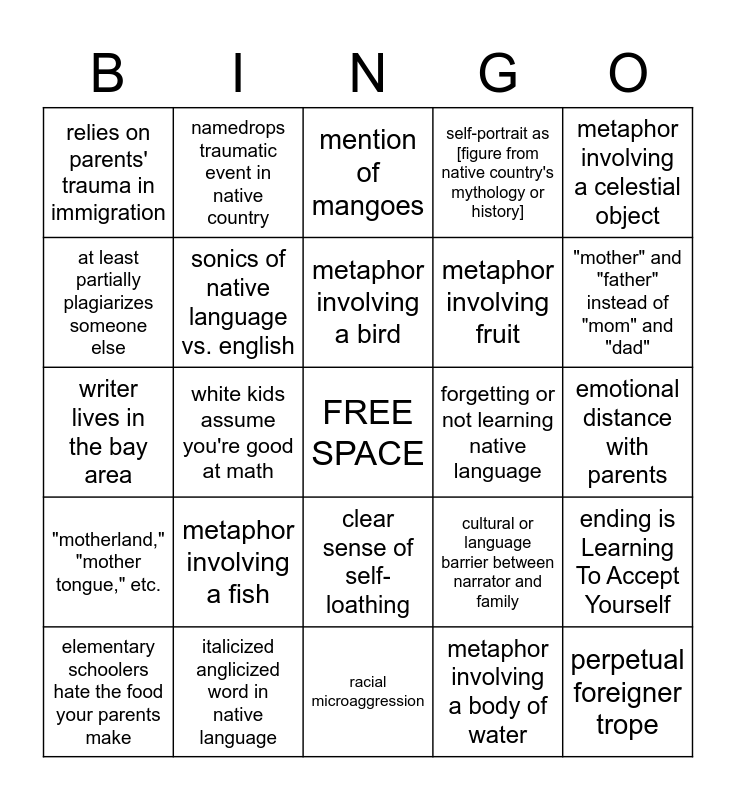 This bingo card has a free space and 24 words: metaphor involving a fish, italicized anglicized word in native language, metaphor involving a bird, elementary schoolers hate the food your parents make, metaphor involving a celestial object, relies on parents' trauma in immigration, at least partially plagiarizes someone else, namedrops traumatic event in native country, forgetting or not learning native language, clear sense of self-loathing, metaphor involving fruit, writer lives in the bay area, cultural or language barrier between narrator and family, ending is Learning To Accept Yourself, sonics of native language vs. english, metaphor involving a body of water, emotional distance with parents, mention of mangoes, "mother" and "father" instead of "mom" and "dad", white kids assume you're good at math, perpetual foreigner trope, "motherland," "mother tongue," etc., self-portrait as [figure from native country's mythology or history] and racial microaggression.