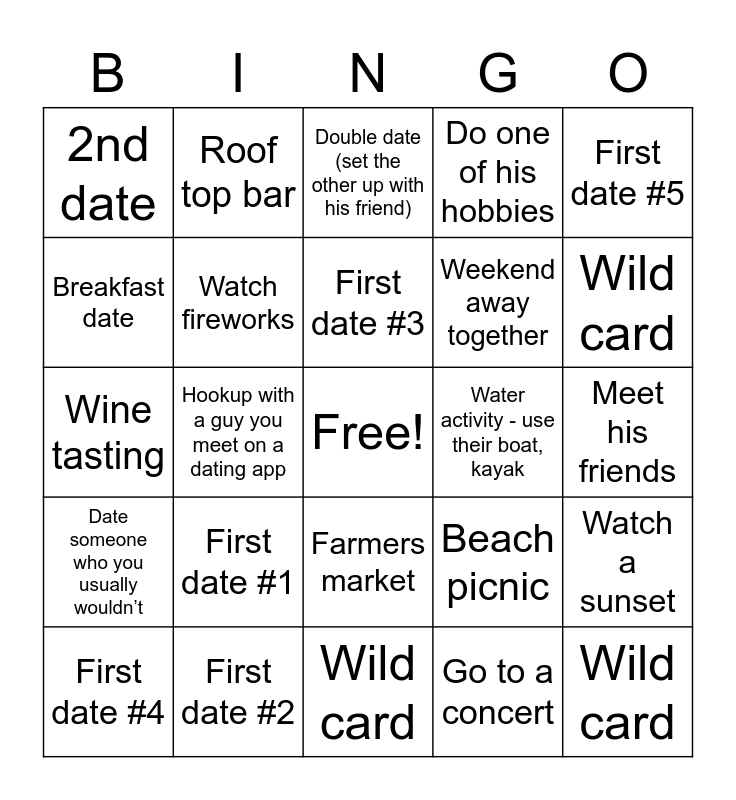 This bingo card has a free space and 24 words: First date #1, First date #2, First date #3, First date #4, First date #5, 2nd date, Breakfast date, Roof top bar, Water activity - use their boat, kayak, Farmers market, Weekend away together, Wine tasting, Beach picnic, Watch a sunset, Watch fireworks, Go to a concert, Meet his friends, Double date (set the other up with his friend), Wild card, Hookup with a guy you meet on a dating app, Wild card, Date someone who you usually wouldn’t, Do one of his hobbies and Wild card.