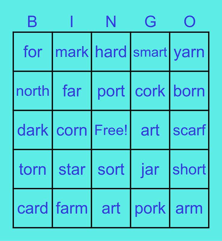 This bingo card has a free space and 29 words: card, cord, corn, form, for, hard, far, star, art, farm, scarf, arm, art, pork, born, fork, sort, torn, yarn, dark, jar, horn, cork, north, smart, mark, short, port and torch.