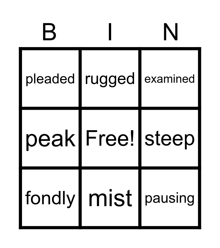 This bingo card has a free space and 8 words: steep, examined, rugged, fondly, pleaded, pausing, peak and mist.