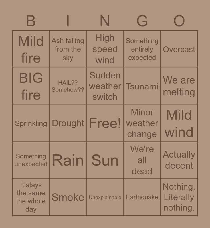This bingo card has a free space and 24 words: Rain, Smoke, Sudden weather switch, It stays the same the whole day, Overcast, Mild fire, BIG fire, Ash falling from the sky, Minor weather change, Sun, Tsunami, Sprinkling, We're all dead, Actually decent, HAIL?? Somehow??, Earthquake, Mild wind, High speed wind, We are melting, Drought, Nothing. Literally nothing., Something unexpected, Something entirely expected and Unexplainable.