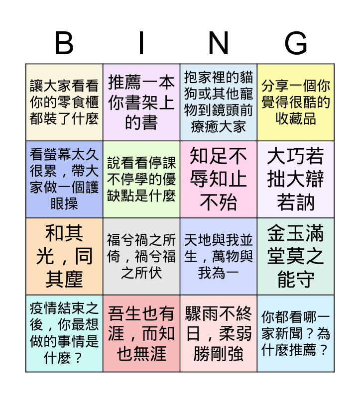 This bingo card has 16 words: 吾生也有涯,而知也無涯, 金玉滿堂莫之能守, 抱家裡的貓狗或其他寵物到鏡頭前療癒大家, 讓大家看看你的零食櫃都裝了什麼, 和其光,同其塵, 推薦一本你書架上的書, 天地與我並生,萬物與我為一, 驟雨不終日,柔弱勝剛強, 看螢幕太久很累,帶大家做一個護眼操, 說看看停課不停學的優缺點是什麼, 疫情結束之後,你最想做的事情是什麼?, 分享一個你覺得很酷的收藏品, 福兮禍之所倚,禍兮福之所伏, 大巧若拙大辯若訥, 知足不辱知止不殆 and 你都看哪一家新聞?為什麼推薦?.