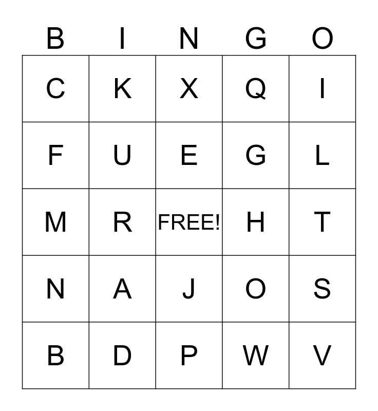 This bingo card has a free space and 24 words: A, D, E, B, I, C, F, K, H, J, G, M, O, S, U, W, T, X, L, R, V, N, Q and P.