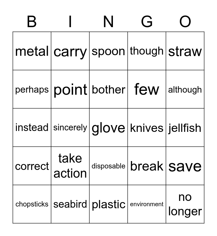 This bingo card has a free space and 24 words: take action, seabird, bother, chopsticks, straw, metal, perhaps, carry, knives, disposable, few, instead, break, save, point, environment, jellfish, spoon, although, sincerely, no longer, correct, though and plastic.