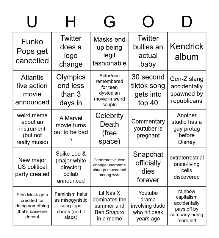 This bingo card has a free space and 24 words: Spike Lee & (major white director) collab announced, Feminism halts as misogynistic song tops charts (and it slaps), Actor/ess remembered for teen dystopian movie in weird couple, Elon Musk gets credited for doing something that's baseline decent, Kendrick album, Funko Pops get cancelled, Atlantis live action movie announced, Twitter does a logo change, Commentary youtuber is pregnant, Performative icon change/username change movement among wyts, 30 second tiktok song gets into top 40, weird meme about an instrument (but not really music), Snapchat officially dies forever, extraterrestrial once-living cells discovered, Olympics end less than 3 days in, Youtube drama involving dude who hit peak years ago, Another studio has a gay protag before Disney, Masks end up being legit fashionable, Gen-Z slang accidentally spawned by republicans, A Marvel movie turns out to be bad :/, rainbow capitalism accidentally pays off by company being more left, New major US political party created, Twitter bullies an actual baby and Lil Nas X dominates the summer and Ben Shapiro in a meme.