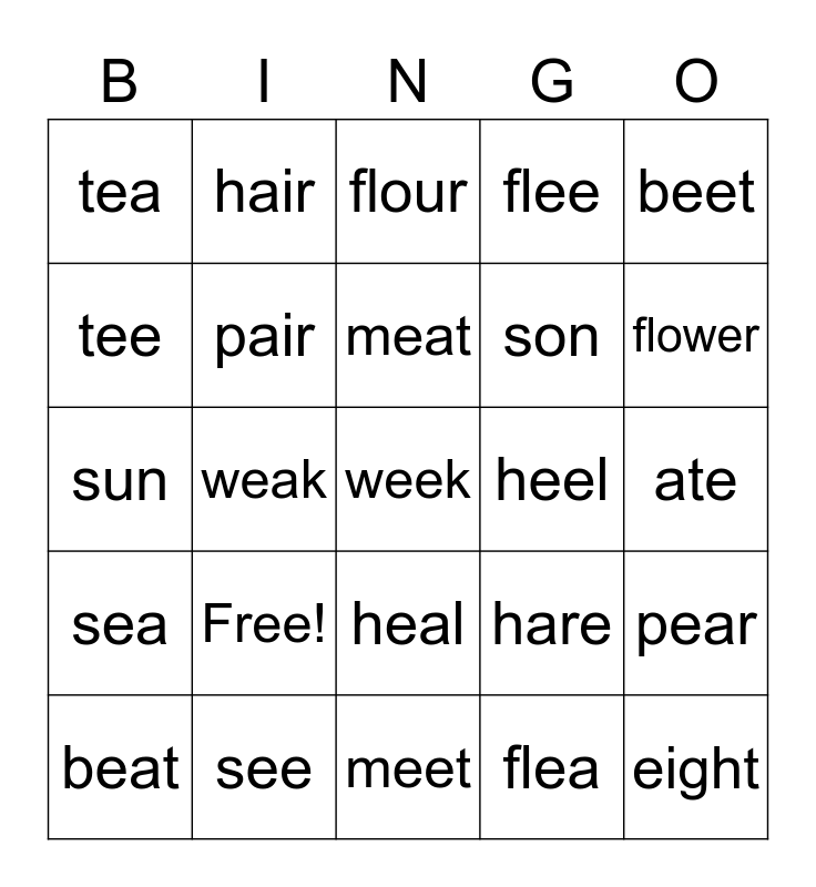 This bingo card has 25 words: Free!, meet, meat, beat, beet, tea, tee, hair, heel, heal, son, sun, hare, pear, pair, eight, ate, flour, flower, weak, week, see, sea, flee and flea.
