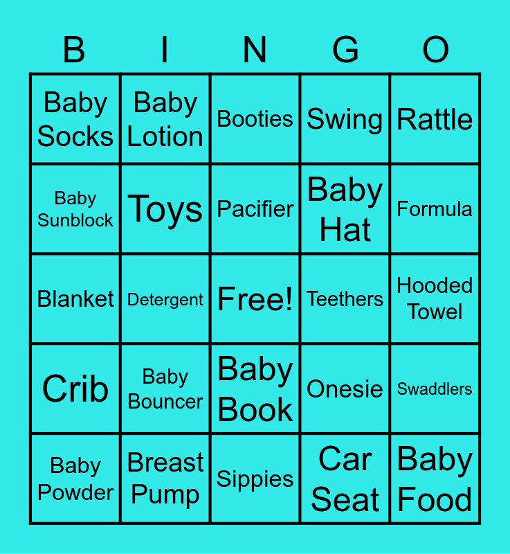 This bingo card has a free space and 34 words: Bottle, Car Seat, Play- Pen, High Chair, Crib, Toys, Rattle, Baby Powder, Baby Lotion, Diaper, Pacifier, Booties, Stroller, Bib, Teethers, Formula, Breast Pump, Blanket, Baby Bouncer, Onesie, Baby Book, Burp Cloth, Baby Socks, Hooded Towel, Sippies, Baby Food, Swing, Outfit, Baby Hat, Baby Sunblock, Baby Swimmers, Detergent, Swaddlers and Safety First Kit.