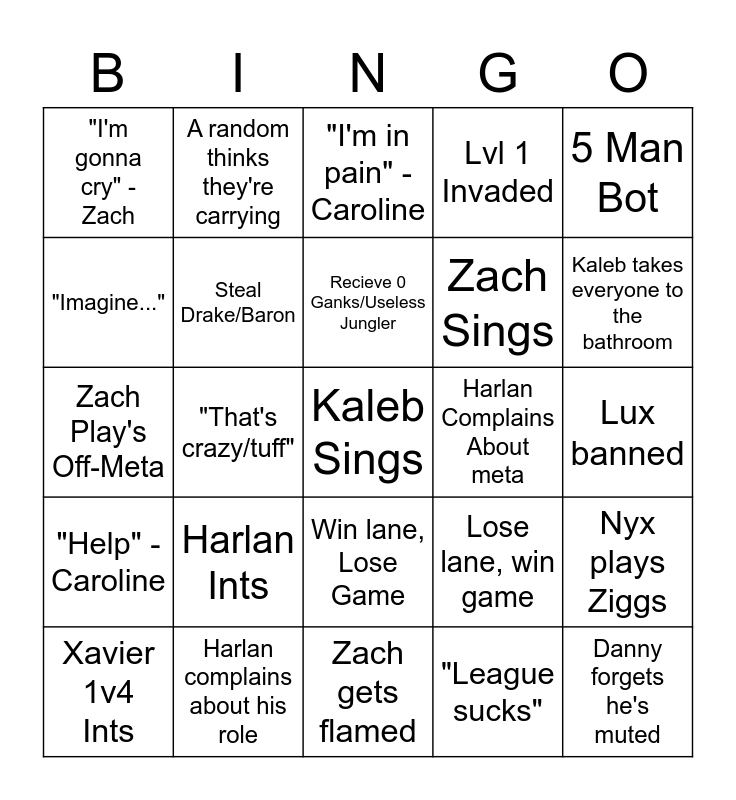 This bingo card has a free space and 24 words: Xavier 1v4 Ints, Harlan Ints, Recieve 0 Ganks/Useless Jungler, "League sucks", 5 Man Bot, "I'm gonna cry" - Zach, A random thinks they're carrying, "I'm in pain" - Caroline, Harlan Complains About meta, Lux banned, Zach Play's Off-Meta, Steal Drake/Baron, Lose lane, win game, Nyx plays Ziggs, "Imagine...", Harlan complains about his role, Zach gets flamed, Lvl 1 Invaded, Kaleb takes everyone to the bathroom, "Help" - Caroline, "That's crazy/tuff", Win lane, Lose Game, Zach Sings and Danny forgets he's muted.