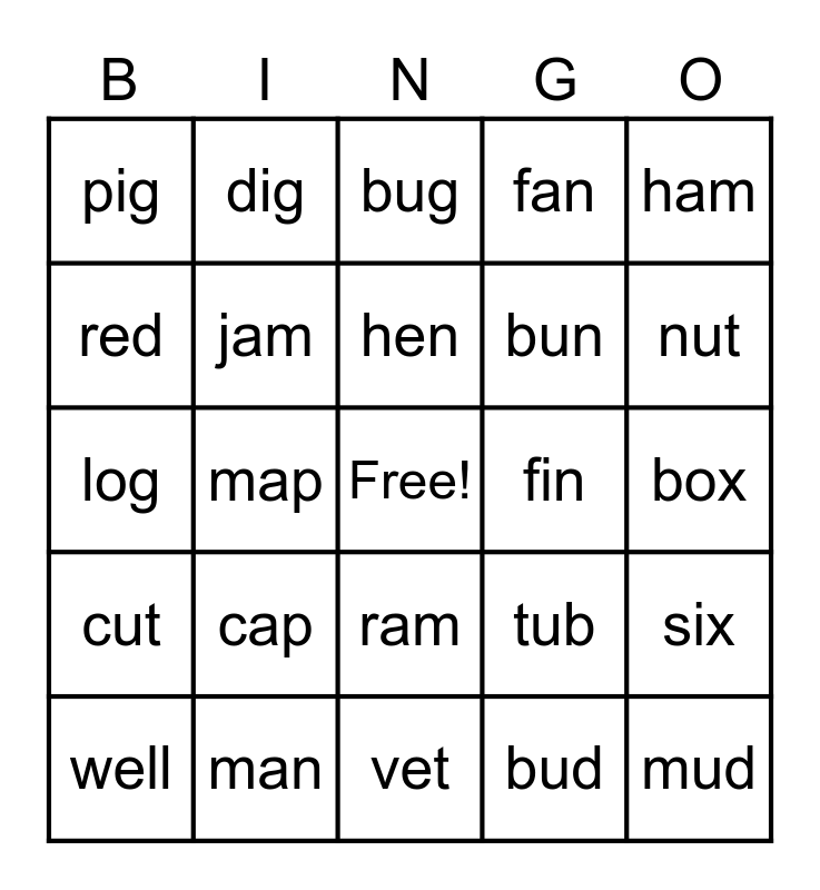 This bingo card has a free space and 24 words: cap, man, hen, well, ham, pig, red, dig, fin, ram, bun, log, tub, six, jam, bud, box, bug, nut, map, mud, cut, fan and vet.