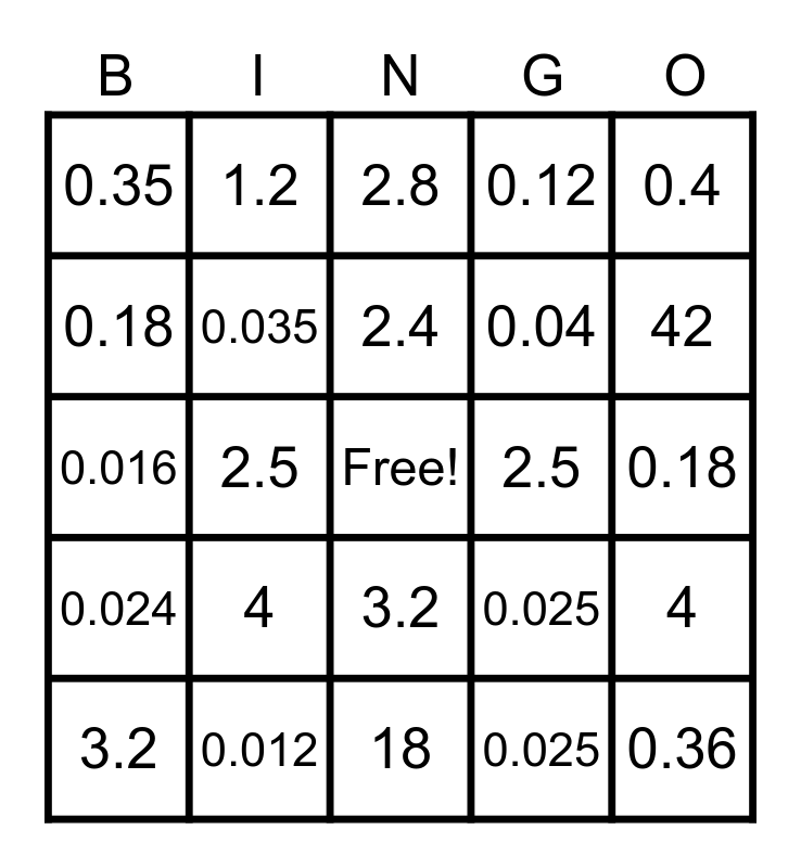 This bingo card has a free space and 59 words: 0.0024, 0.012, 0.016, 0.024, 0.025, 0.027, 0.035, 0.036, 0.04, 0.09, 0.12, 0.16, 0.18, 0.25, 0.27, 0.35, 0.36, 0.4, 1.2, 2.4, 2.5, 2.8, 3.2, 4, 18, 25, 32, 40, 42, 0.4, 0.0024, 2.8, 0.036, 25, 1.2, 42, 0.12, 2.5, 0.035, 0.016, 0.16, 4, 0.18, 0.27, 32, 0.35, 40, 3, 3.2, 18, 0.09, 0.36, 0.012, 0.25, 2.4, 0.025, 0.024, 0.027 and 0.04.