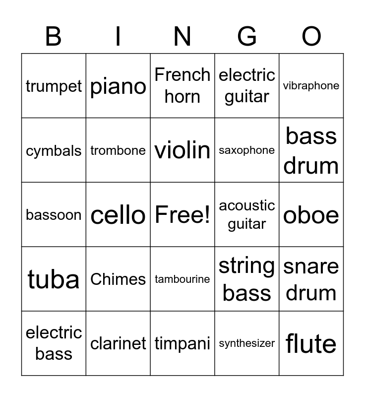 This bingo card has a free space and 24 words: Chimes, clarinet, violin, electric bass, vibraphone, trumpet, cymbals, piano, acoustic guitar, tambourine, saxophone, bassoon, string bass, snare drum, trombone, synthesizer, oboe, French horn, bass drum, cello, flute, tuba, electric guitar and timpani.