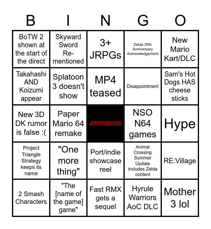 This bingo card has a free space and 24 words: "One more thing", "The [name of the game] game", MP4 teased, 2 Smash Characters, New Mario Kart/DLC, BoTW 2 shown at the start of the direct, Takahashi AND Koizumi appear, Skyward Sword Re-mentioned, NSO N64 games, Port/indie showcase reel, Disappointment, New 3D DK rumor is false :(, Animal Crossing Summer Update includes Zelda content, RE:Village, Splatoon 3 doesn't show, Hyrule Warriors AoC DLC, Hype, 3+ JRPGs, Sam's Hot Dogs HAS cheese sticks, Paper Mario 64 remake, Mother 3 lol, Project Triangle Strategy keeps its name, Zelda 35th Anniversary Acknowledgement and Fast RMX gets a sequel.