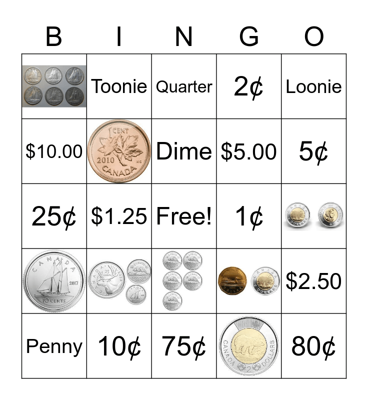 This bingo card has 12 images, a free space and 22 words: Loonie, Penny, Toonie, Nickel, Dime, Quarter, $1.00, $2.00, 1¢, 5¢, 10¢, 25¢, 75¢, 80¢, 2¢, 20¢, $5.00, $10.00, $7.00, $1.25, $2.50 and $1.10.