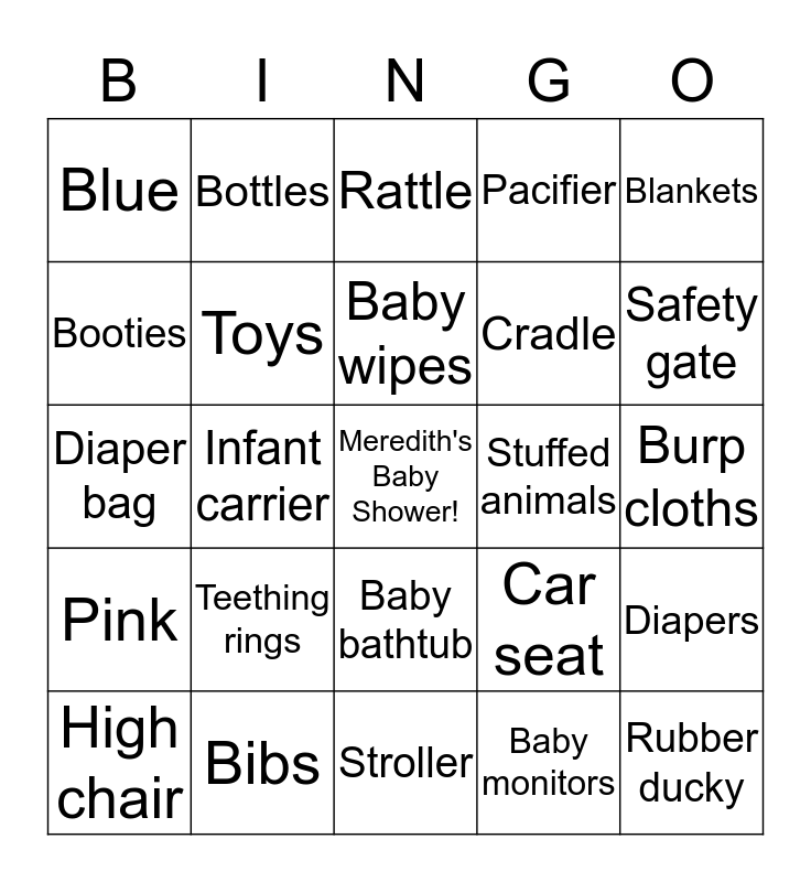 This bingo card has a free space and 26 words: Baby bathtub, Baby monitors, Baby wipes, Bibs, Blankets, Blue, Booties, Bottles, Burp cloths, Car seat, Cradle, Diaper bag, Diapers, High chair, Infant carrier, Mobiles, Pacifier, Pink, Rattle, Rubber ducky, Safety gate, Stroller, Stuffed animals, Teething rings, Toys and Hooded Towels.