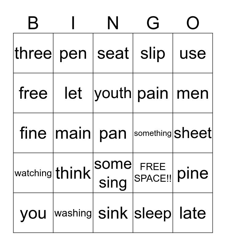 This bingo card has 25 words: think, sink, youth, you, use, three, free, pen, something, some sing, pain, fine, FREE SPACE!!, pine, let, late, sheet, seat, men, main, pan, washing, watching, slip and sleep.