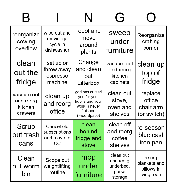 This bingo card has a free space and 24 words: Cancel old subscriptions and move to CC, Scope out weightlifting routine, Change and clean out Litterbox, Clean out worm bin, Reorganize crafting corner, reorganize sewing overflow, clean out the fridge, wipe out and run vinegar cycle in dishwasher, clean out stove, oven and shelves, clean behind fridge and stove, vacuum out and reorg kitchen cabinets, vacuum out and reorg kitchen drawers, clean off and reorg coffee shelves, re-season blue cast iron pan, set up or throw away espresso machine, clean out and reorg underbed, purse storage, replace office chair arm (or switch), repot and move around plants, clean up top of fridge, clean up and reorg office, re org blankets and pillows in living room, Scrub out trash cans, sweep under furniture and mop under furniture.