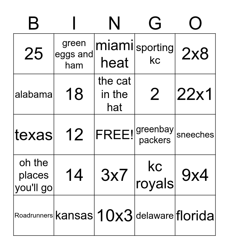 This bingo card has a free space and 24 words: 14, kansas, the cat in the hat, Roadrunners, 2x8, 25, alabama, green eggs and ham, greenbay packers, 3x7, 2, texas, kc royals, 9x4, 18, delaware, sneeches, miami heat, 22x1, 12, florida, oh the places you'll go, sporting kc and 10x3.