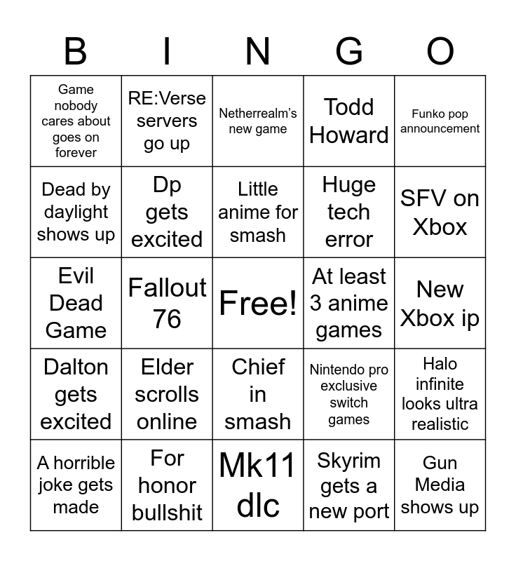This bingo card has a free space and 24 words: Elder scrolls online, For honor bullshit, Little anime for smash, A horrible joke gets made, Funko pop announcement, Game nobody cares about goes on forever, Dead by daylight shows up, RE:Verse servers go up, At least 3 anime games, Chief in smash, Huge tech error, Evil Dead Game, Nintendo pro exclusive switch games, Halo infinite looks ultra realistic, Dp gets excited, Skyrim gets a new port, New Xbox ip, Netherrealm’s new game, SFV on Xbox, Fallout 76, Gun Media shows up, Dalton gets excited, Todd Howard and Mk11 dlc.