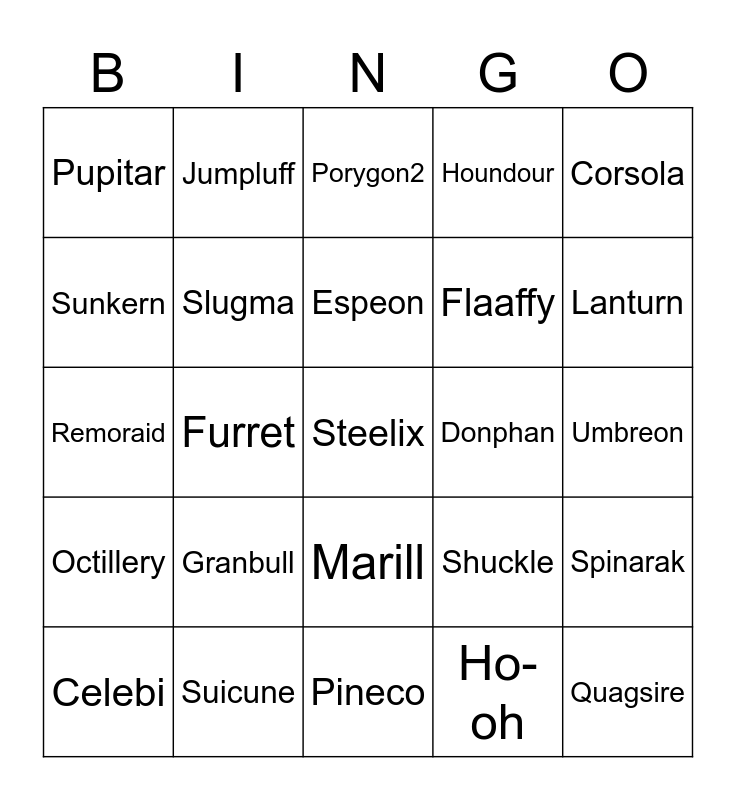 This bingo card has 25 words: Granbull, Pineco, Espeon, Celebi, Corsola, Pupitar, Sunkern, Jumpluff, Donphan, Marill, Flaaffy, Remoraid, Shuckle, Spinarak, Slugma, Quagsire, Umbreon, Porygon2, Lanturn, Furret, Steelix, Suicune, Octillery, Houndour and Ho-oh.
