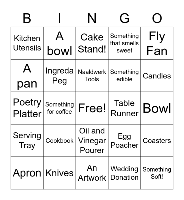 This bingo card has a free space and 34 words: Honeymoon Donation, Wedding Donation, Future Savings, Tablecloth, Serving Tray, Ingreda Peg, Fly Fan, Apron, A bowl, Dish Cover, Naaldwerk Tools, Cake Stand!, Pot Holders, Twista, Table Runner, Candles, Knives, Poetry Platter, Cookbook, Egg Poacher, Oil and Vinegar Pourer, Splatter Guard, Kitchen Utensils, Bowl, An Artwork, Something Soft!, Something that smells sweet, Something alcoholic, Something edible, A pan, Gift card, Something for coffee, Coasters and Something preserved.
