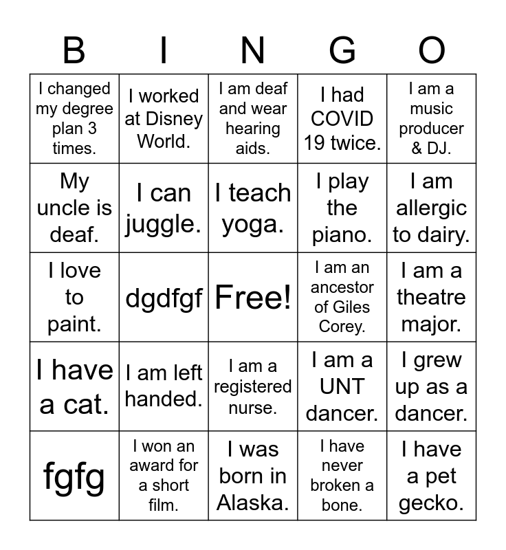 This bingo card has a free space and 27 words: My favorite color is light pink., I won an award for a short film., I teach yoga., I have never broken a bone., I am a music producer & DJ., My uncle is deaf., I worked at Disney World., I was born in Alaska., I am an ancestor of Giles Corey., I grew up as a dancer., I have a cat., I can juggle., I am a UNT dancer., I have a pet gecko., I love to paint., I love animals and plants., I am deaf and wear hearing aids., I had COVID 19 twice., I am a theatre major., I changed my degree plan 3 times., I am left handed., I am a registered nurse., I play the piano., I am allergic to dairy., fgfg, dgdfgf and bfgdgdg.