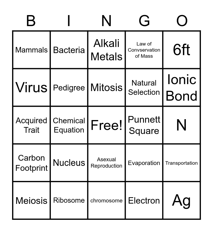 This bingo card has a free space and 24 words: Nucleus, Ribosome, Mitosis, Meiosis, 6ft, Mammals, Virus, Bacteria, Punnett Square, Asexual Reproduction, Natural Selection, Acquired Trait, Evaporation, Transportation, Pedigree, Electron, N, Alkali Metals, Ionic Bond, Chemical Equation, Ag, Carbon Footprint, Law of Convservation of Mass and chromosome.