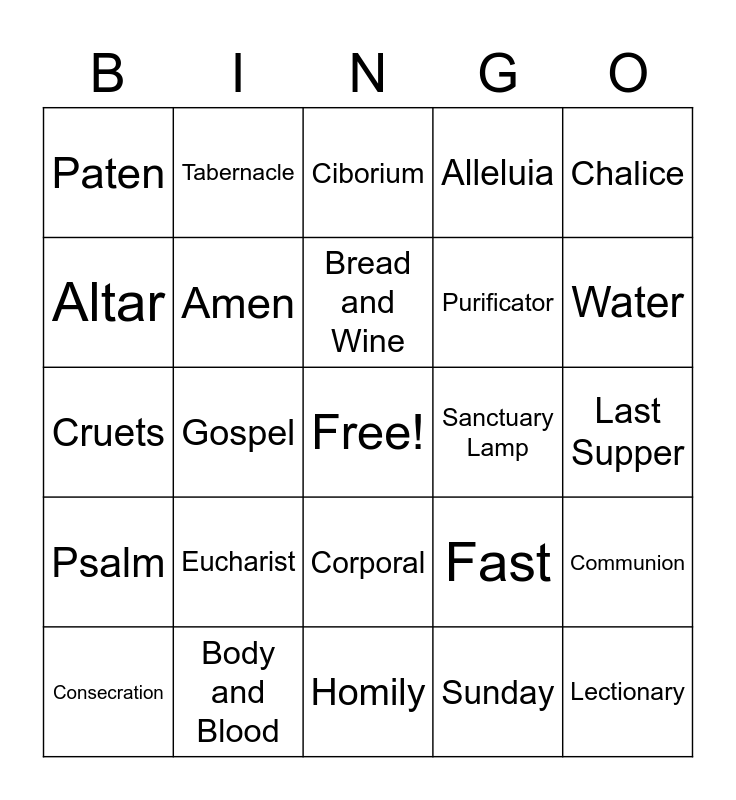 This bingo card has a free space and 24 words: Eucharist, Body and Blood, Bread and Wine, Consecration, Chalice, Paten, Altar, Tabernacle, Sanctuary Lamp, Corporal, Purificator, Cruets, Fast, Communion, Amen, Sunday, Last Supper, Ciborium, Water, Gospel, Lectionary, Psalm, Alleluia and Homily.