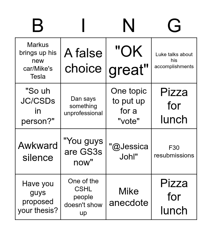 This bingo card has 17 words: Mike anecdote, Have you guys proposed your thesis?, "OK great", Markus brings up his new car/Mike's Tesla, "You guys are GS3s now", Luke talks about his accomplishments, F30 resubmissions, One topic to put up for a "vote", Pizza for lunch, Dan says something unprofessional, One of the CSHL people doesn't show up, "@Jessica Johl", "So uh JC/CSDs in person?", A false choice, Awkward silence, Something something good job surviving COVID and Pizza for lunch.