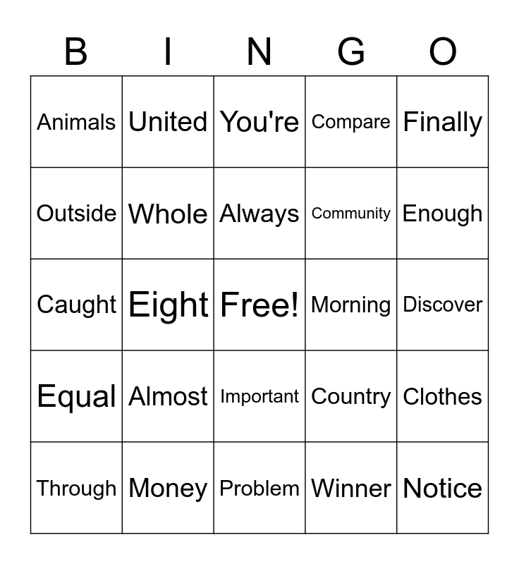 This bingo card has a free space and 24 words: Almost, Money, Always, Through, Finally, Animals, Outside, United, Morning, Important, Community, Caught, Country, Clothes, Whole, Winner, Discover, You're, Enough, Eight, Notice, Equal, Compare and Problem.