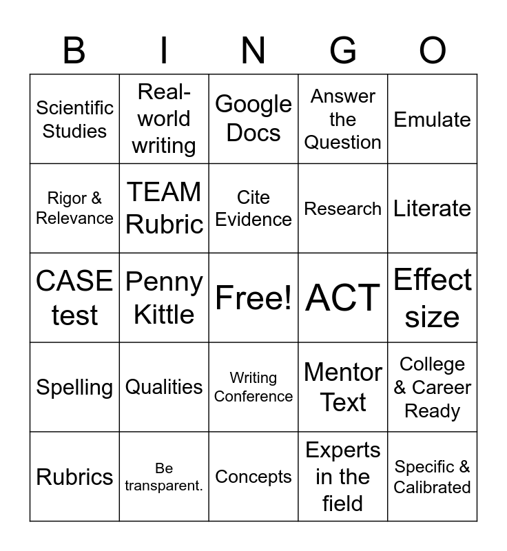 This bingo card has a free space and 24 words: Qualities, Be transparent., Cite Evidence, Rubrics, Emulate, Scientific Studies, Rigor & Relevance, Real-world writing, ACT, Writing Conference, Research, CASE test, Mentor Text, College & Career Ready, TEAM Rubric, Experts in the field, Effect size, Google Docs, Literate, Penny Kittle, Specific & Calibrated, Spelling, Answer the Question and Concepts.