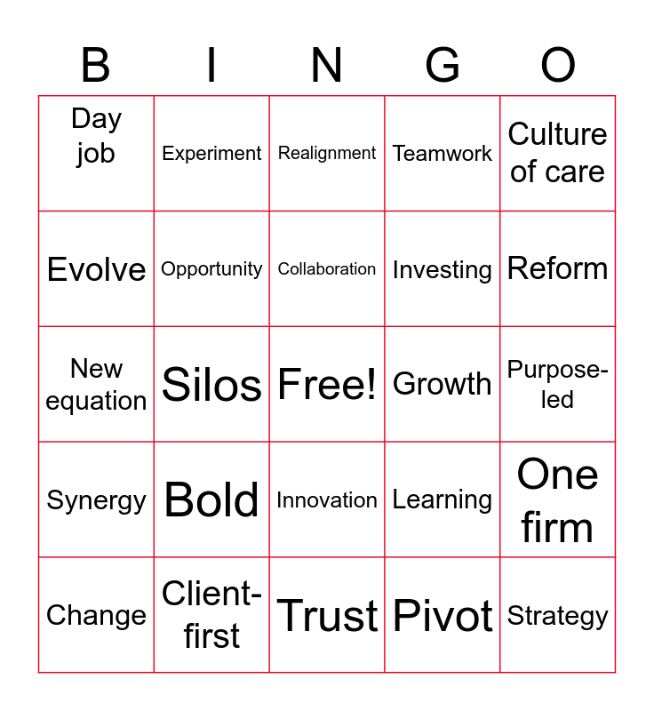 This bingo card has a free space and 24 words: Bold, Client-first, Collaboration, Change, Culture of care, Day job, Evolve, Experiment, Growth, Innovation, Investing, New equation, Learning, One firm, Opportunity, Pivot, Purpose-led, Realignment, Reform, Silos, Strategy, Synergy, Teamwork and Trust.
