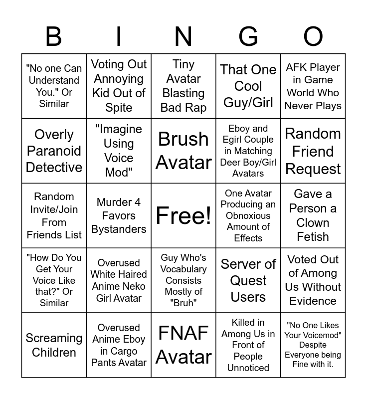This bingo card has a free space and 24 words: Overused White Haired Anime Neko Girl Avatar, Overused Anime Eboy in Cargo Pants Avatar, Brush Avatar, Screaming Children, AFK Player in Game World Who Never Plays, "No one Can Understand You." Or Similar, Overly Paranoid Detective, Voting Out Annoying Kid Out of Spite, One Avatar Producing an Obnoxious Amount of Effects, Guy Who's Vocabulary Consists Mostly of "Bruh", Eboy and Egirl Couple in Matching Deer Boy/Girl Avatars, Random Invite/Join From Friends List, Server of Quest Users, Voted Out of Among Us Without Evidence, "Imagine Using Voice Mod", Killed in Among Us in Front of People Unnoticed, Gave a Person a Clown Fetish, Tiny Avatar Blasting Bad Rap, Random Friend Request, Murder 4 Favors Bystanders, "No One Likes Your Voicemod" Despite Everyone being Fine with it., "How Do You Get Your Voice Like that?" Or Similar, That One Cool Guy/Girl and FNAF Avatar.